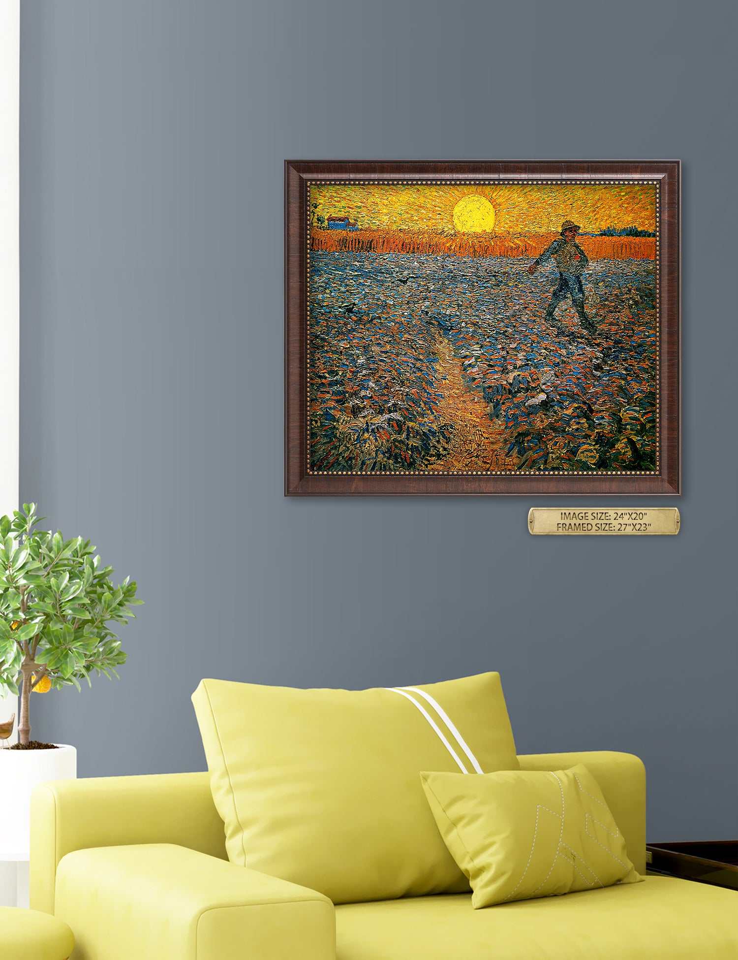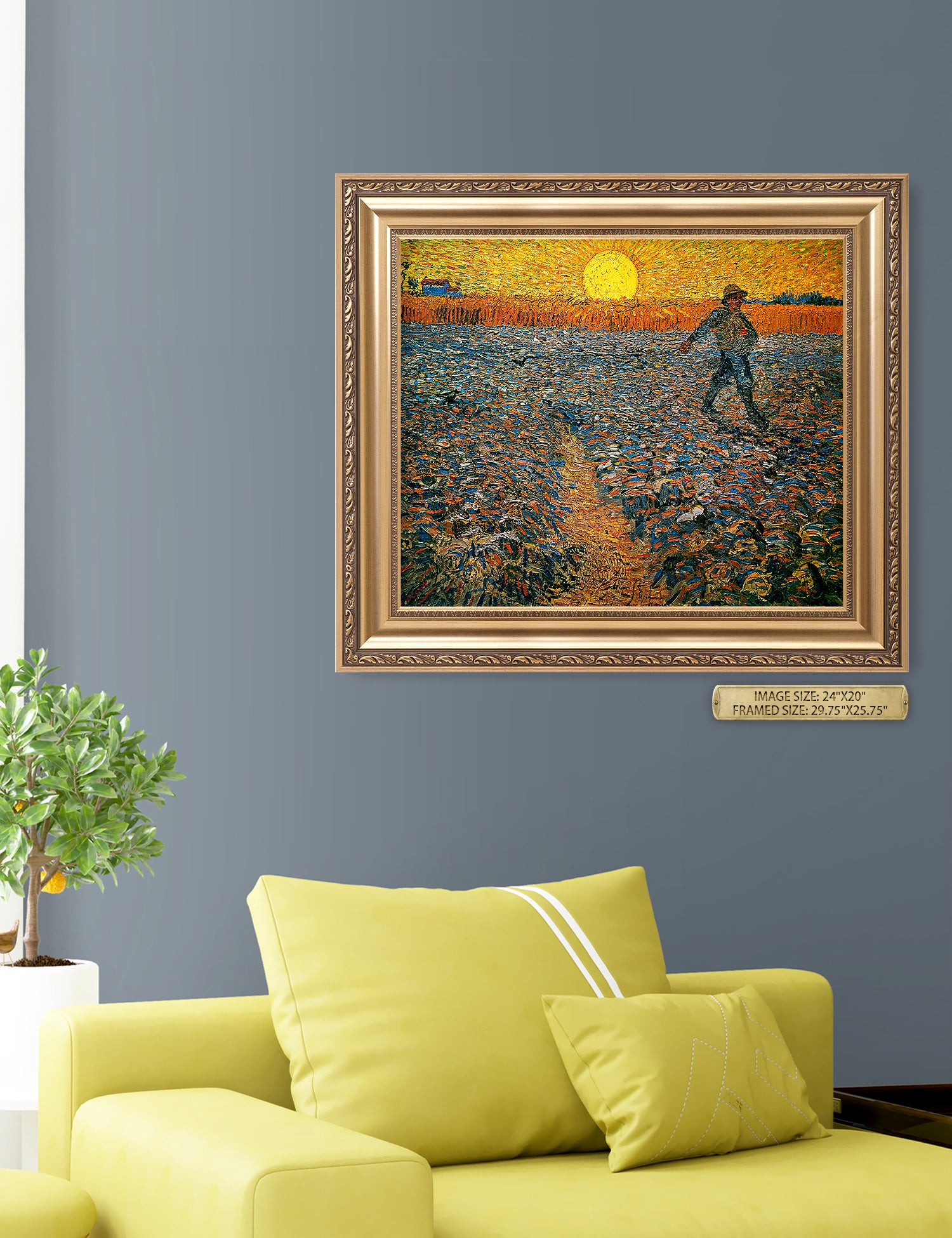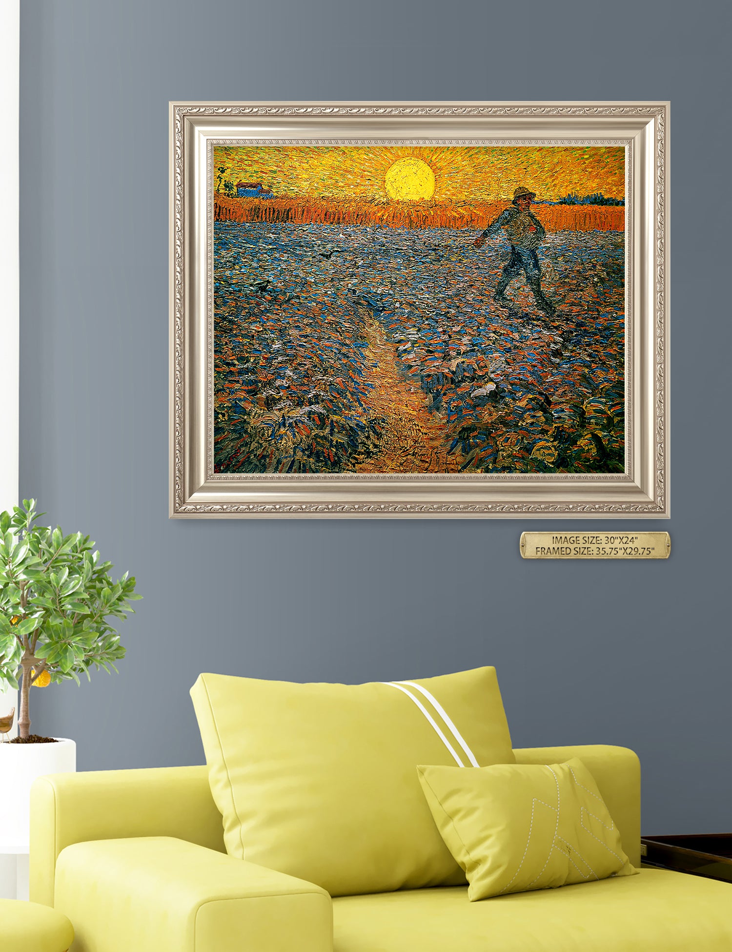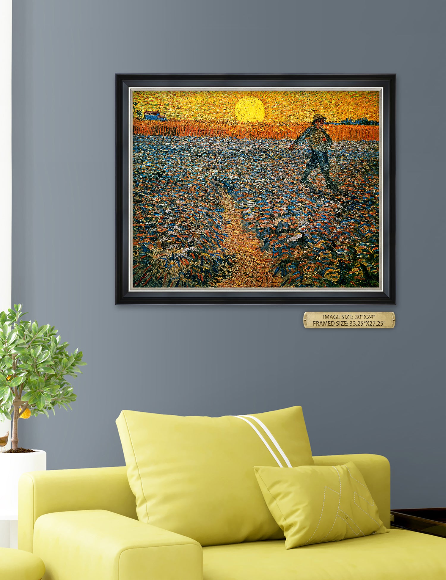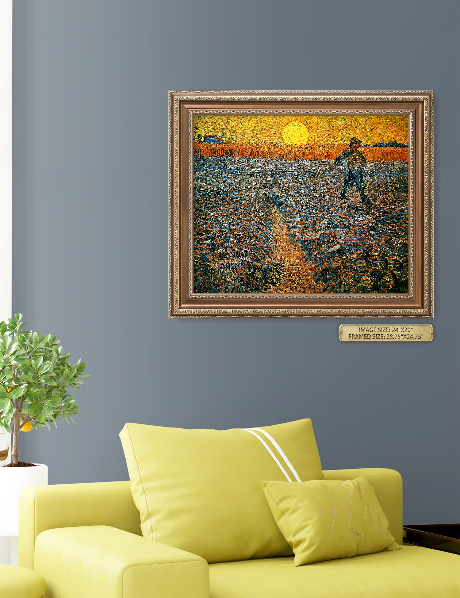 Van Gogh’s example for this painting is The sower from 1850 by French painter Jean-François Millet, whom he admires greatly. He makes dozens of drawings after his great example, but in Arles he wants to paint a new, ‘modern’ version. Not dark, grey and without much colour, like Millet, but with radiant colours and sharp contrasts.