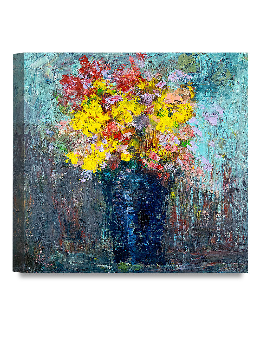 In this modern painting, the expressive flurry of brushstroke and moody blue background transforms this simple still life of a flower pot into a soulful work of art. It is striking and yet versatile.